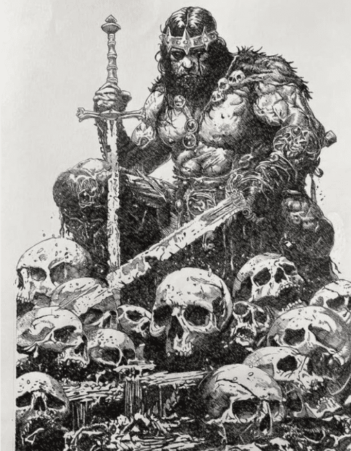 Sobre un trono forjado con las calaveras de quienes osaron desafiarlo, el guerrero permanece, no solo como rey, sino como vestigio viviente de guerras olvidadas. Cada cráneo, testigo silencioso del precio de la ambición, sostiene el peso de un legado teñido de sangre. Su espada, desgastada y letal, ya no es solo un arma, sino la prolongación de su eterna condena.