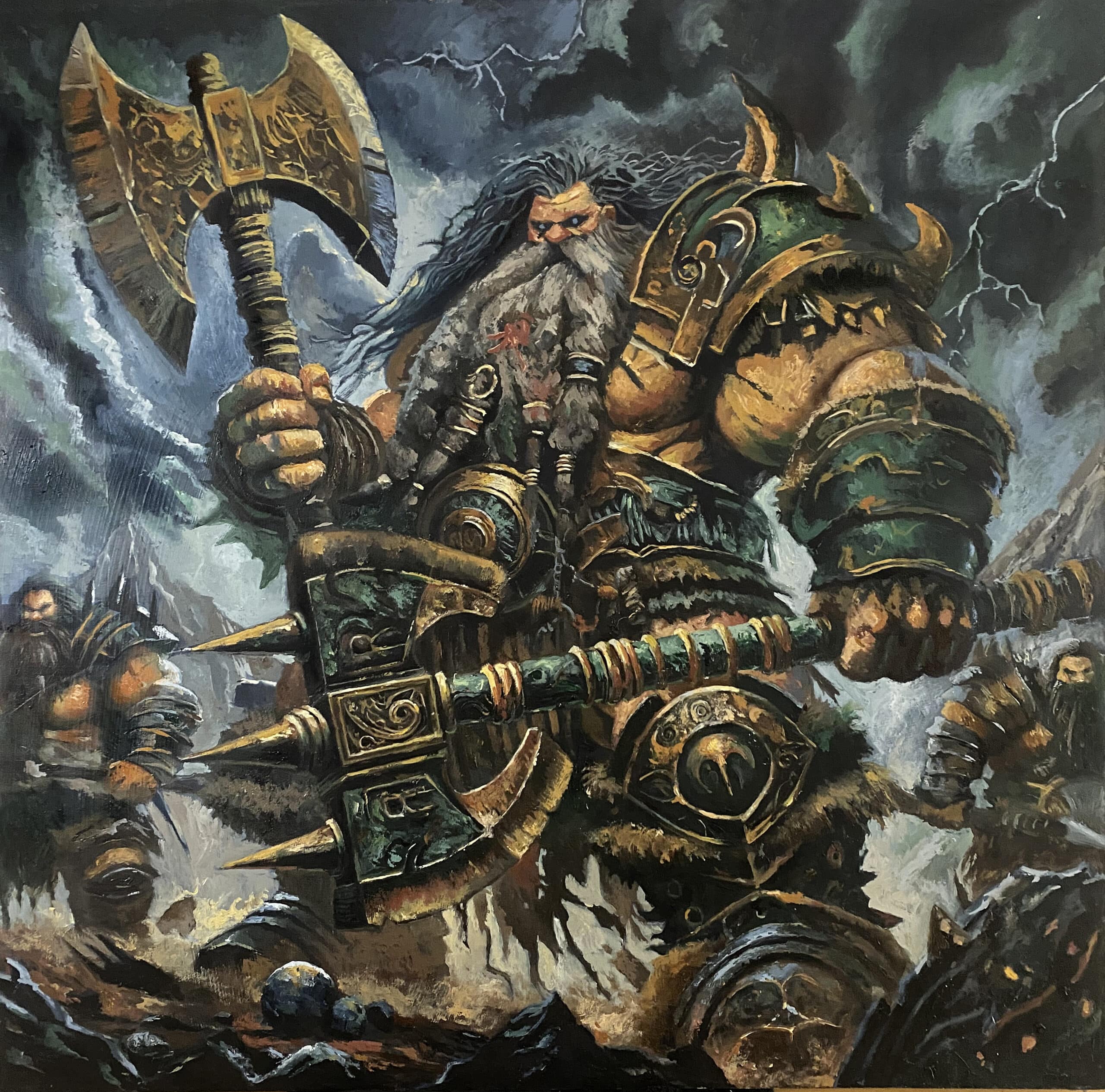 Bajo cielos cargados de tormenta, los enanos marchan hacia el corazón de la oscuridad, donde las sombras susurran secretos antiguos y la batalla final aguarda. La tierra tiembla bajo el peso de sus pasos, mientras las hachas brillan con un fulgor deslumbrante, listas para desatar su furia contra los enemigos que esperan en las profundidades. Cada guerrero lleva consigo no solo armas y armaduras, sino también el orgullo ancestral de una raza que nunca retrocede ante el peligro.