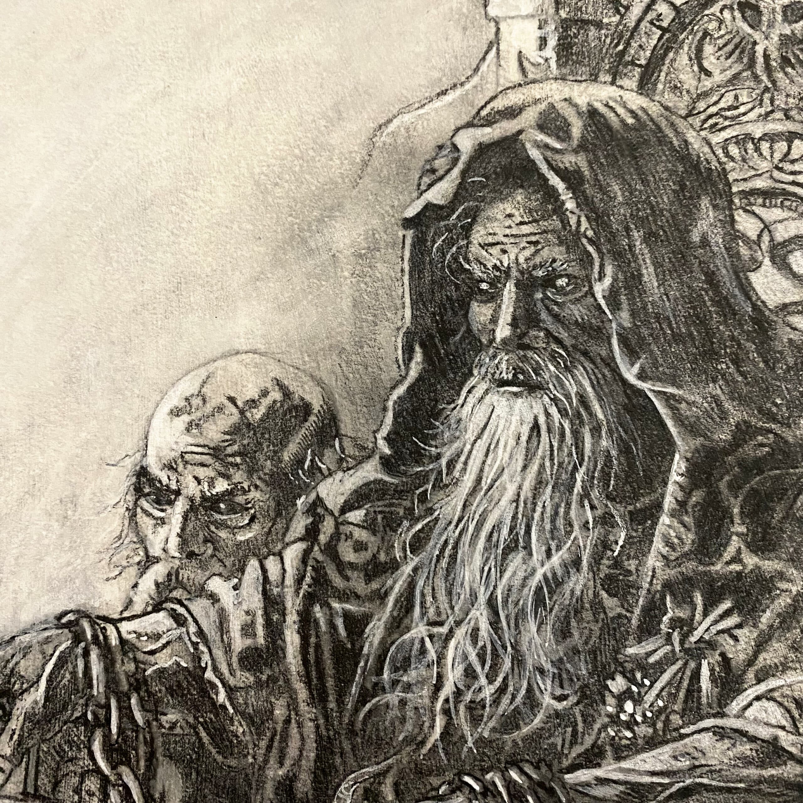 Encaramado en su trono, el anciano rey parece más una sombra que un hombre, atrapado en una prisión invisible de cadenas que no solo atan su cuerpo, sino también su espíritu. Su mirada vacía y su postura encorvada reflejan la lucha interna entre la oscuridad que lo consume y la luz que aún intenta abrirse paso. Este momento simboliza la fragilidad del poder cuando se ve contaminado por la maldad y la manipulación, pero también es un recordatorio de que incluso en los momentos más oscuros, la fuerza de voluntad puede ser el arma definitiva para romper esas cadenas.
