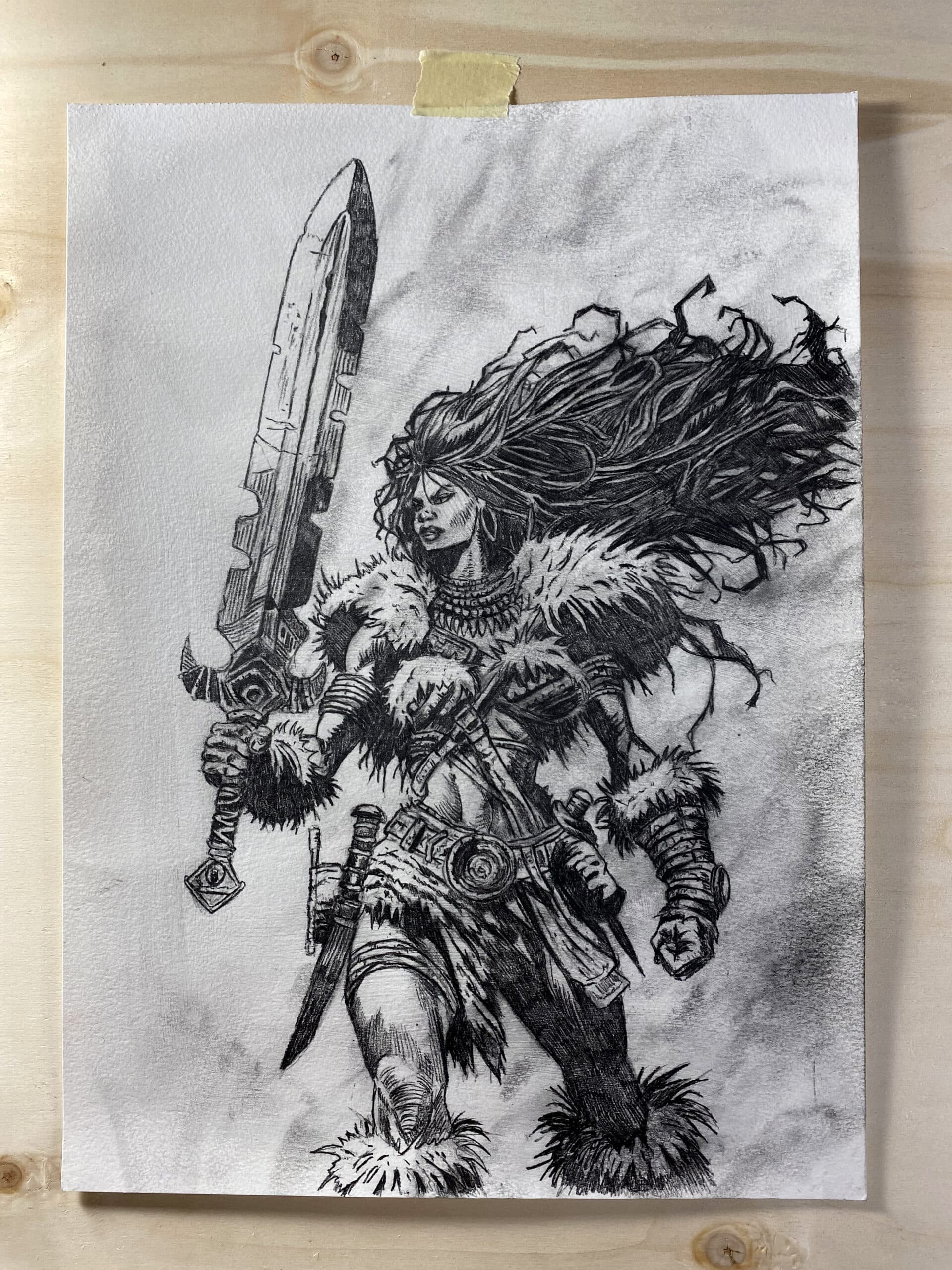 Con la espada como una extensión de su voluntad, ella camina silenciosa entre la quietud tensa que precede a la batalla. Su figura, envuelta en pieles desgarradas y cicatrices que cuentan historias de mil enfrentamientos, irradia una fuerza indomable que desafía al destino mismo. Cada paso que da resuena como un eco en el vacío, cargado de una determinación que no necesita palabras. Es la encarnación de la guerra: salvaje, implacable y hermosa en su brutalidad.