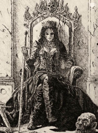 Sentada sobre el trono sombrío, forjado con huesos de aquellos que osaron desafiarla, gobierna con mirada fría y voluntad implacable. Su corona brilla con la luz opaca de almas atrapadas, y en su mano sostiene un cetro que ha sentenciado destinos enteros. Alrededor suyo, la desolación y los restos de sus enemigos son testimonio silencioso de su poder absoluto. La eternidad es su condena y su fortaleza, encerrada en una prisión de piedra y silencio, escuchando los ecos infinitos de súplicas que ya no pueden tocar su corazón. Ella espera paciente, segura de que ningún ser puede escapar a su juicio o a su castigo.
